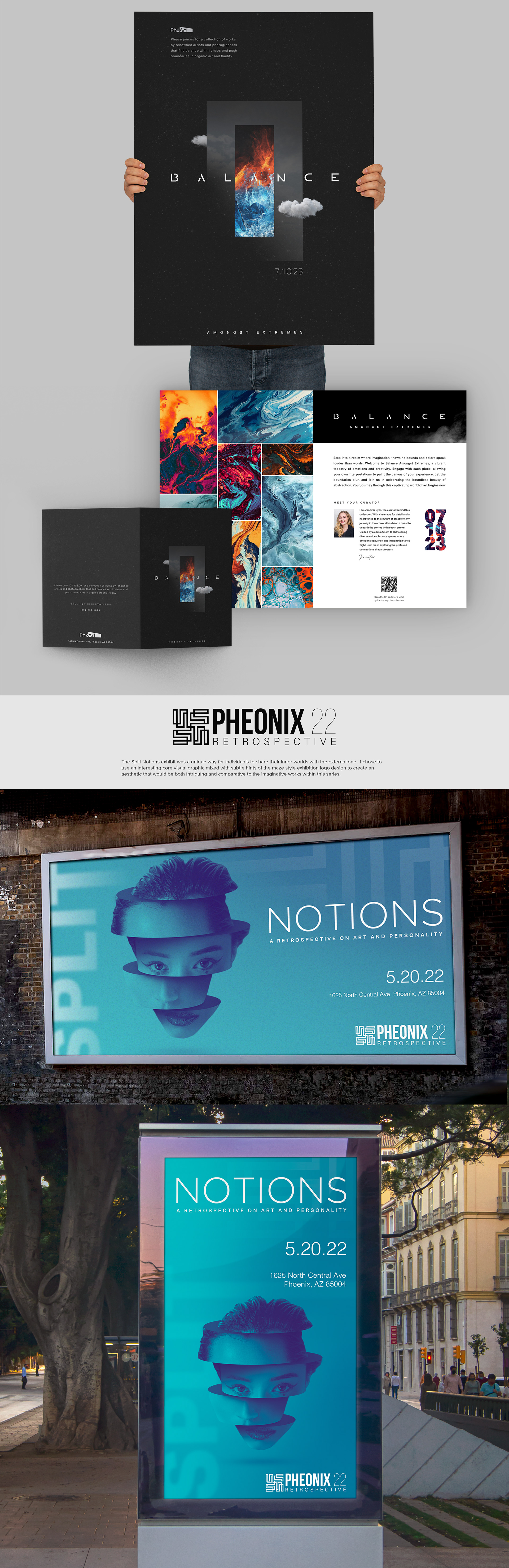 Creatives needed to be original artwork and something that would motivate and entice people to show up and support their local artists. For the Balance Amongst Extremes show collateral I chose to experiment with scale and composition to create an interesting visual that encapsulated the creativity the viewers would experience.